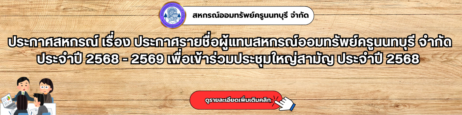 ประกาศสหกรณ์ เรื่อง ประกาศรายชื่อผู้แทนสหกรณ์ออมทรัพย์ครูนนทบุรี จำกัด ประจำปี 2568 - 2569 เพื่อเข้าร่วมประชุมใหญ่สามัญ ประจำปี 2568