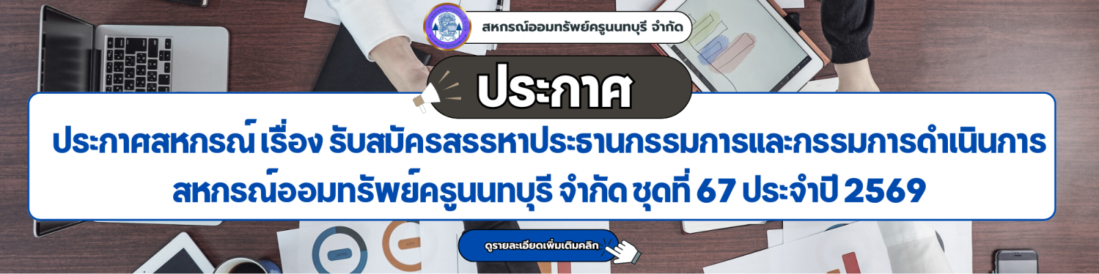 ประกาศสหกรณ์ เรื่อง รับสมัครสรรหาประธานกรรมการและกรรมการดำเนินการสหกรณ์ออมทรัพย์ครูนนทบุรี จำกัด ชุดที่ 67 ประจำปี 2569